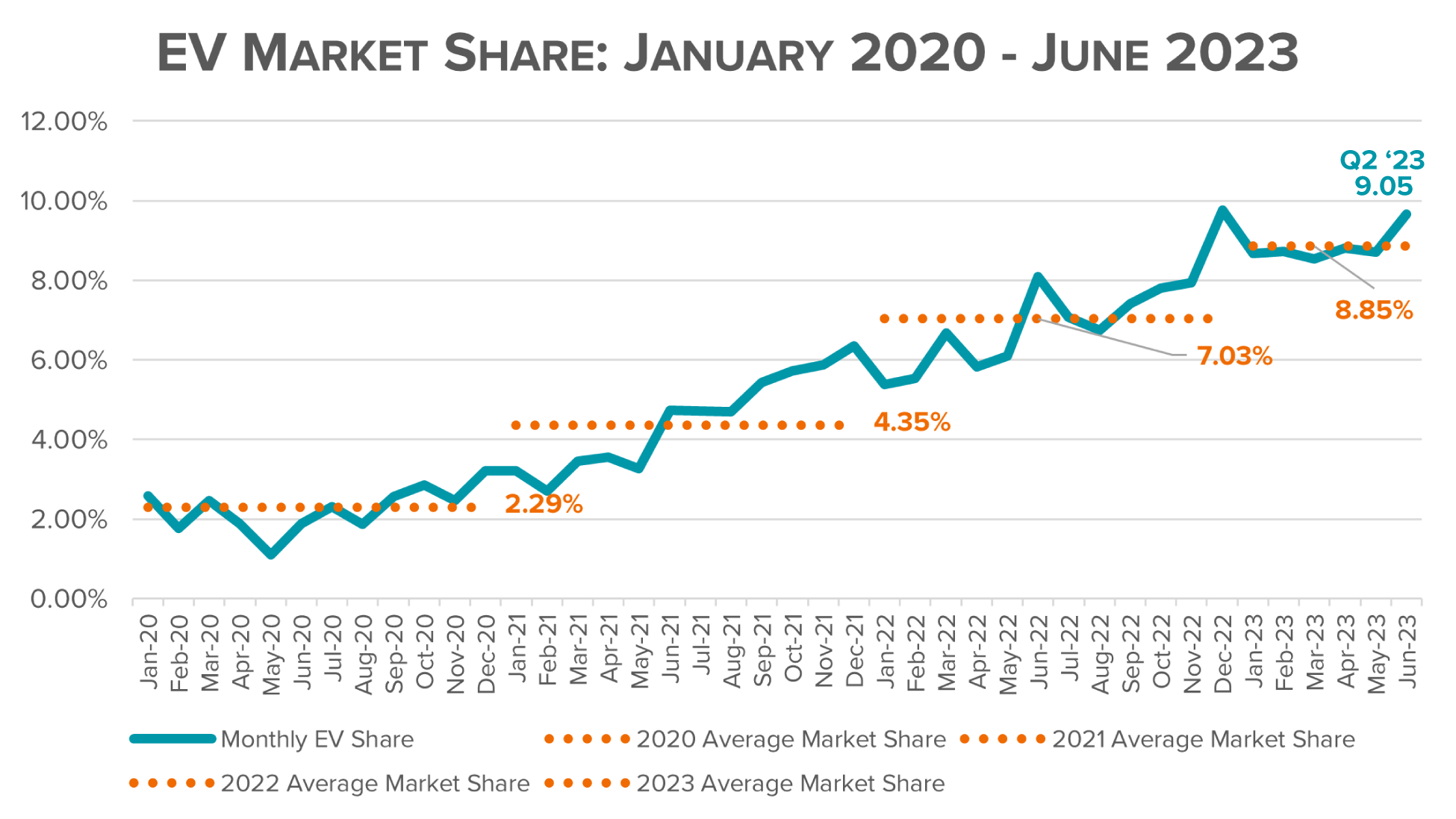 - EVs represent 9.1 percent of new light-duty vehicle sales in Q2 2023, up from 8.6 percent in Q1 2023 and 6.6 percent in Q2 2022;