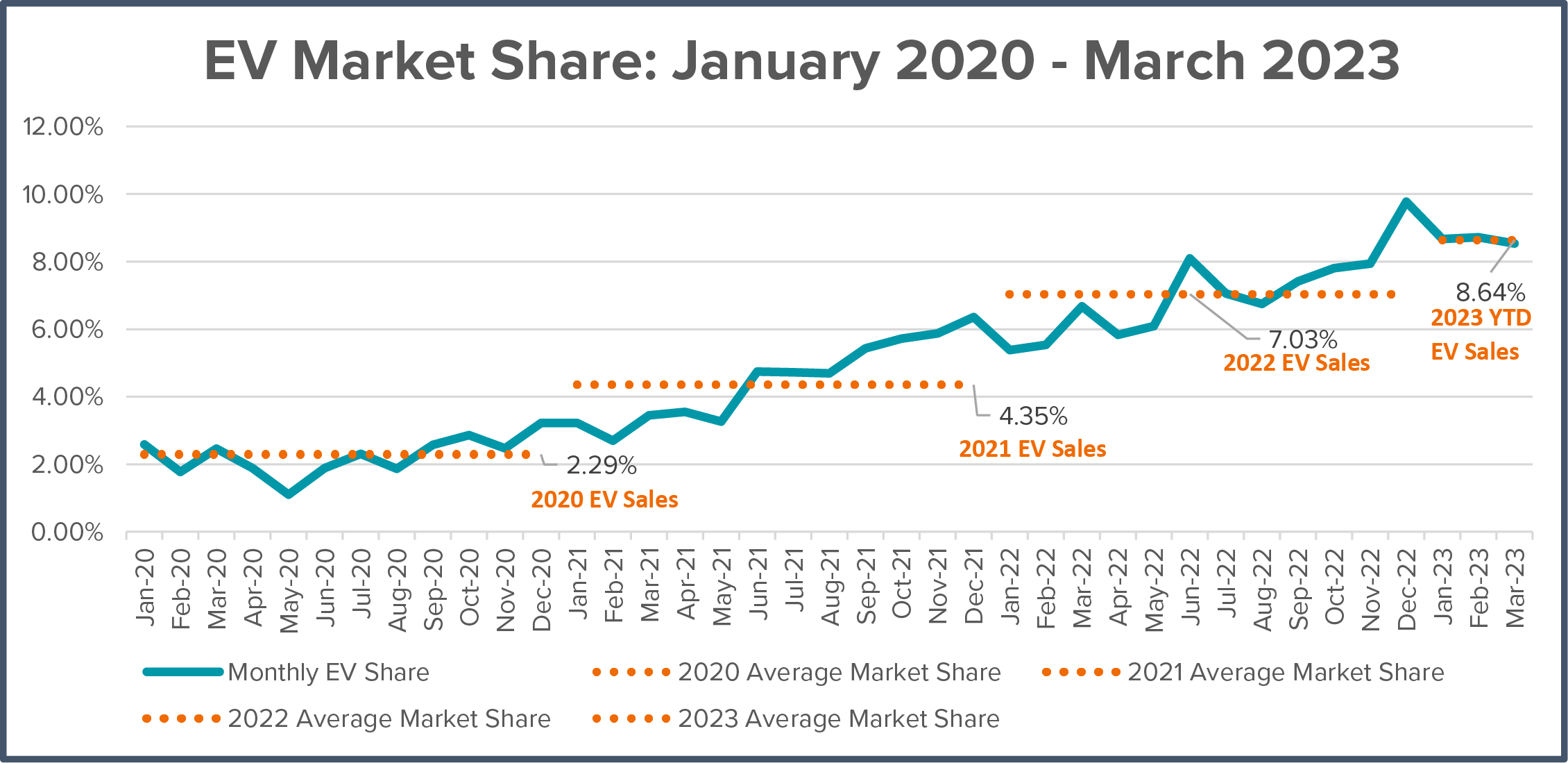 - EVs represent 8.6 percent of new light-duty vehicle sales in Q1 2023, up slightly from 8.5 percent in Q4 2022 and 5.9 percent in Q1 2022;