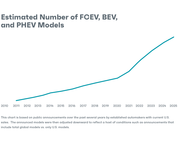 More than 80 models of plug-in hybrid (PHEV), fully electric (BEV), and fuel cell electric vehicles (FCEV) are available now to consumers — and more are on the way. Automakers are providing our customers with record-breaking choice in energy-efficient models, while also providing even safer, more environmentally friendly, affordable vehicles. The automotive industry is investing more than $330 billion by 2025 in its commitment to vehicle electrification. Electric vehicles (EVs) are an important part of our mission, both in the U.S. and around the world.
