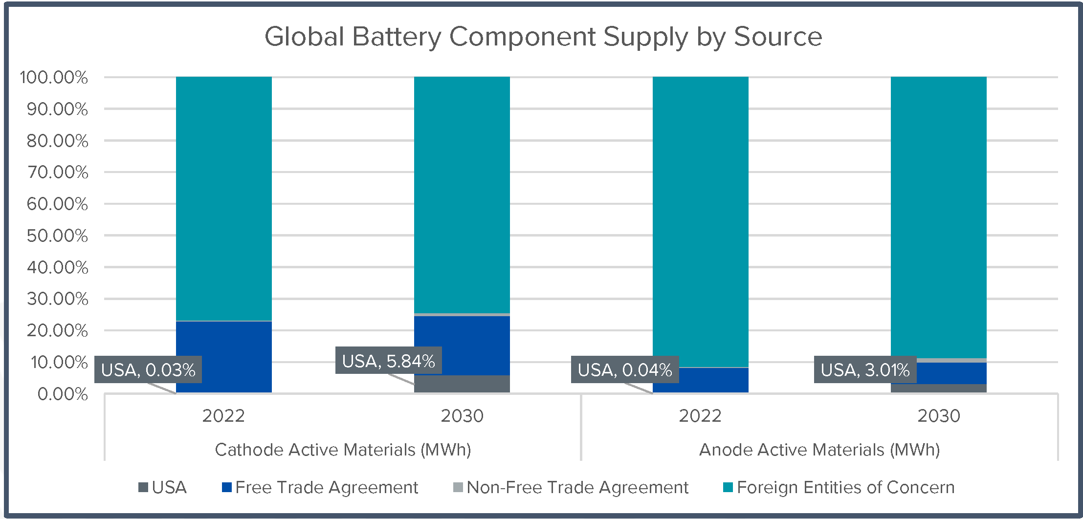 - China (designated as a foreign entity of concern) is predicted to remain the largest producing country for cathode active materials through at least 2040;