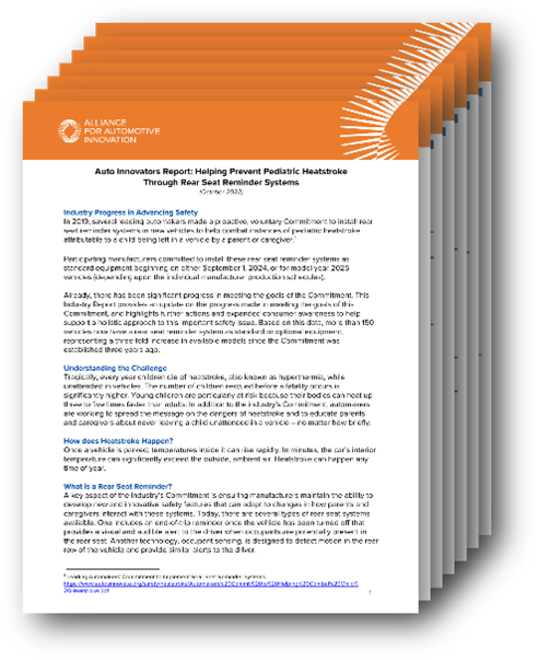 Read the Auto Innovators report: Helping Prevent Pediatric Heatstroke Through Rear Seat Reminder Systems.